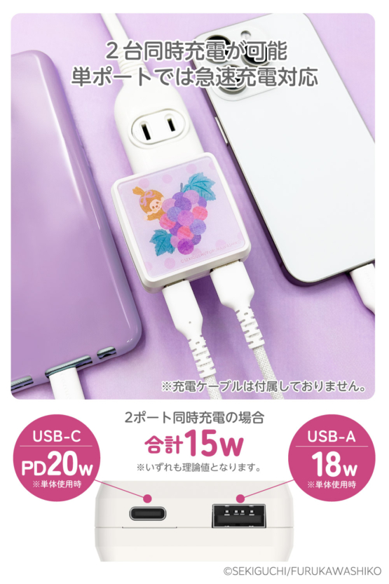 ●USB-Cx1とUSB-Ax1合計2ポートで2台同時充電可能。