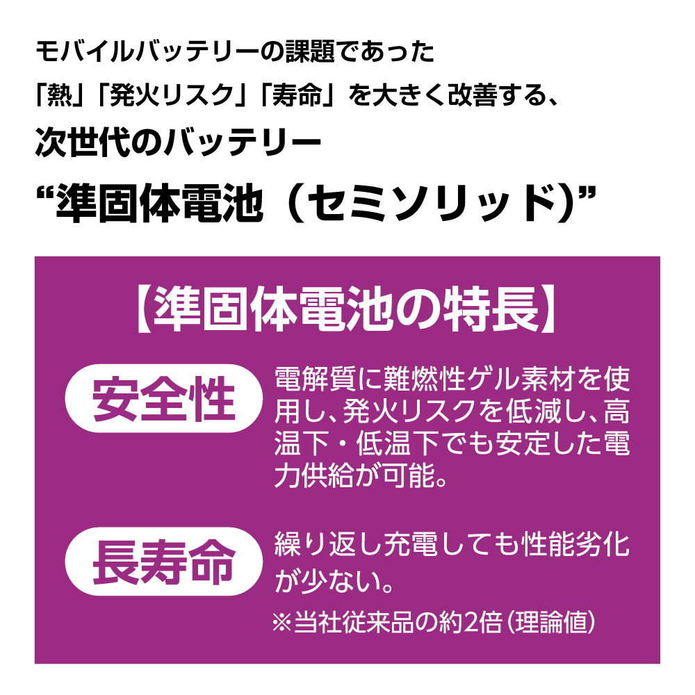 電解質に難燃性ゲル素材を使用し、発火リスクを低減し、高温下・低温下でも安定した電力供給が可能。